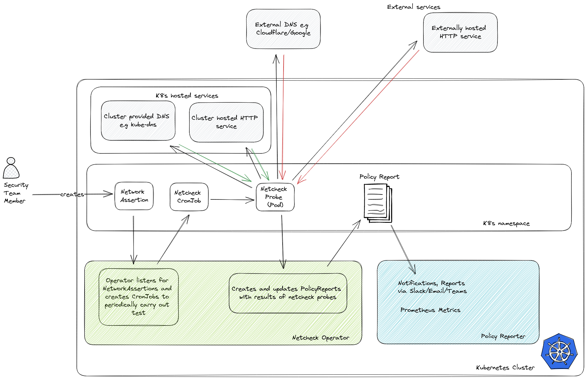 CronJoband run the tests that make up a particular network assertion. External data may be mounted into the Pod for use by the probe. - Listens for probe Pods created by the NetworkAssertion's CronJob and parses assertion results from the Pod logs.